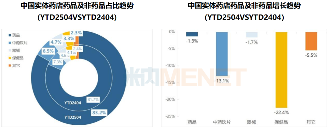 2025年1-4月,药品占药店销售的83.2%,较2024年同期上升了1.6个百分点,器械的份额与往期略上涨0.1个百分点,中药饮片和保健品的份额则分别降了0.7和0.8个百分点。
