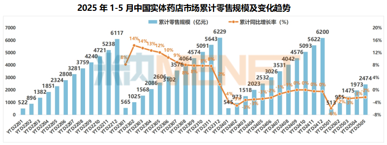 2025年1-5月中国实体药店的累计规模为2474亿元,较去年同期累计规模下滑了2.3%。面对低迷的消费环境,各大连锁也做出了围绕大健康展开的开拓新品类、新服务的尝试,使得市场略有起色,未来发展如何将拭目以待。