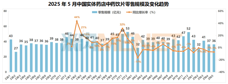 2025年5月全国实体药店中药饮片零售规模为36亿元,较4月规模减少了1亿元,也低于同期3亿元,中药饮片也同样呈现增长乏力之势。