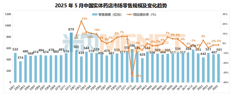 总体分析:5月中国实体药店零售规模(药品+非药)为501亿元,市场下滑趋缓