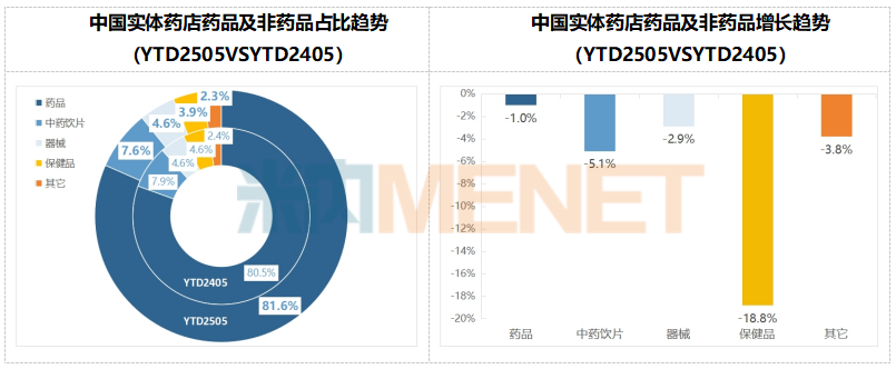 2025年1-5月,药品占药店销售的81.6%,较2024年同期上升了1.1个百分点,器械的份额与往期持平,中药饮片和保健品的份额则分别降了0.3和0.7个百分点。