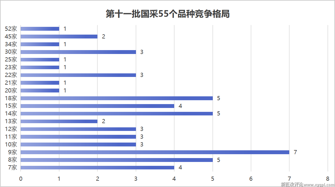 按上市许可持有人统计,第11批拟采购的55个品种竞争格局均≥7家,截止至9月8日,竞争格局最高达到了52家,超过20家以上的品种达14个。