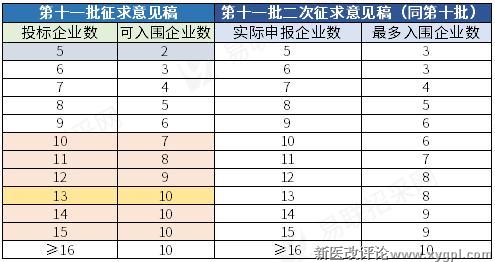 此前的《征求意见稿》曾将入围机制调整为"N-3"竞价入围机制,但《二次征求意见稿》明确,考虑到在投标企业数不同的情况下,简单使用"N-3"入围规则会造成不同的品种入围率差异大,拟继续沿用第十批集采做法,入围企业最多不超过10家,保持入围率总体稳定。
