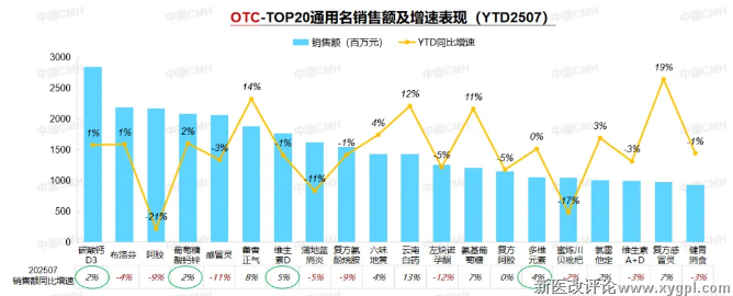 7月,OTC市场中碳酸钙D3、葡萄糖酸钙锌、维生素D等维矿头部品种同比增长,驱动维矿品类同比保持增长。