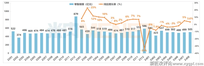 总体分析:8月中国实体药店零售规模(药品+非药)为504亿元,前8月累计下滑收窄,行业呈现震荡调整