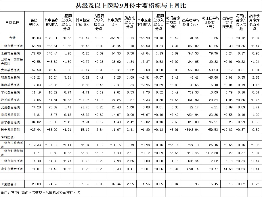 (一)1-9月份12家总医院运行情况:医药总收入283610.34万元,比去年同期293534.28万元减少9923.94万元,下降3.38%(不含体检、疫苗接种和结算差额等收入的医药收入为233861.74万元,比去年同期254504.36万元,减少20642.62万元,下降8.11%)。其中:医疗服务收入145082.26万元,占医药收入51.16%(床位收入7736.85万元、手术治疗护理等服务收入121923.20万元,结算差额15422.21万元),比去年同期139171.96万元,医疗服务收入增加5910.30万元,增长4.25%;检查化验收入55989.01万元,占医药收入19.74%,同比下降14.44%;药品收入59398.61万元,药占比20.94%,分别比去年同期下降6.82%、下降0.77个百分点;卫生材料收入23140.46万元(其中高值耗材收入11698.63万元),占医药总收入8.16%,比去年同期8.58%,下降0.42个百分点。入院人次229218人次,比去年同期247807人次,减少18589人次,下降7.50%;门急诊人次5134986人次,比去年同期5101772人次,增加33214人次,增长0.65%;每门诊次均费用203.93元,比去年同期209.84元,减少5.91元,下降2.82%;出院者平均费用6892.92元,比去年同期6800.67元,增加92.24元,增长1.36%。