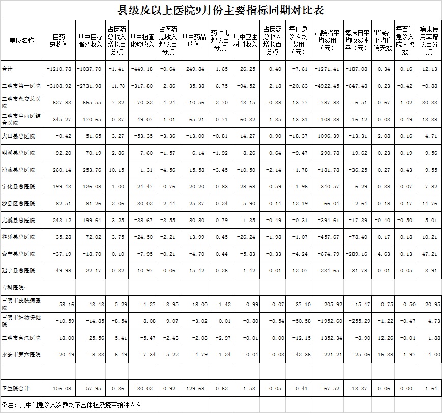1-9月份基层医疗机构医药总收入35023.98万元(其中村所收入4377.29万元),去年同期39479.32万元,同比减少4455.33万元,下降11.29%,其中:医疗服务收入10404.24万元,占医药收入29.71%(床位收入630.37万元、手术治疗护理等服务收入9773.87万元,结算差额85.93万元),去年同期11460.64万元, 医疗服务收入同比减少1056.40万元,下降9.22%;检查化验收入1468.74万元,同比下降32.75%;药品收入23029.20万元,去年同期25711.03万元,同比减少2681.83万元,下降10.43%,药占比65.75%,去年同期65.13%,同比增长0.63个百分点;卫生材料收入121.80万元,较去年同期123.59万元,同比减少1.79万元,占医药收入0.35%,较去年同期0.31%,同比增长0.03个百分点。入院人次36392人次,去年同期55177人次,同比减少18785人次,下降34.04%,其中明溪县、泰宁县、宁化县分别下降63.01%、53.37%、48.49%;门急诊人次4604067人次(其中村所诊疗1502165人次),去年同期4605441人次,同比减少1374人次,下降0.03%(基层诊疗量占比为47.24%,较去年同期的47.44%下降0.2个百分点);每门诊次均费用68.71元,去年同期73.59元,同比减少4.88元,下降6.63%;出院者平均费用905.34元,去年同期978.90元,同比减少73.56元,下降7.51%。