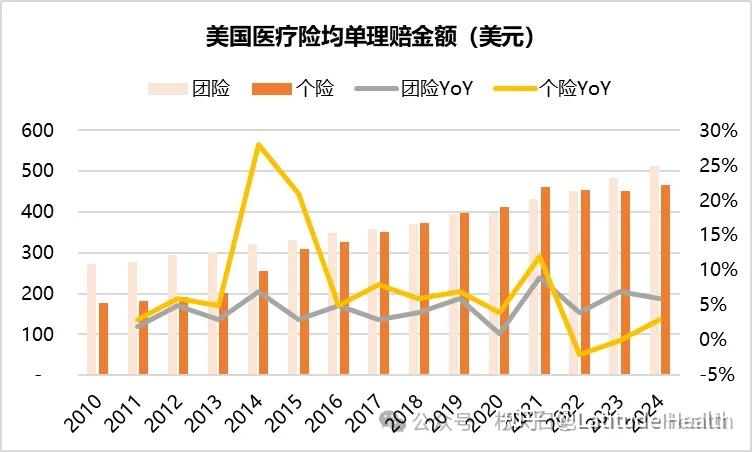 这一时期团险的平均理赔金额的增速一直较为稳定,除了2021年就医反弹导致的9%的增速,其他的增速一般都在7%以下。但是,在疫情后的高就医率导致的赔付金额还是达到了6-7%的水平,说明团险的限制更少,福利水平更高。而个险呈现了均单理赔增速的大幅趋缓,原因是个险大部分是HMO产品,就医网络被限制,抑制了医疗使用率的上升。同时,叠加大量健康体大幅流入市场,摊薄了个险均单理赔金额的增速。