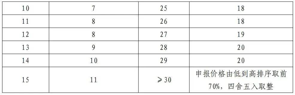 同一竞价单元内,依据申报企业报价由低到高进行排名,按照拟中选企业取数表(下图)确定拟中选企业。