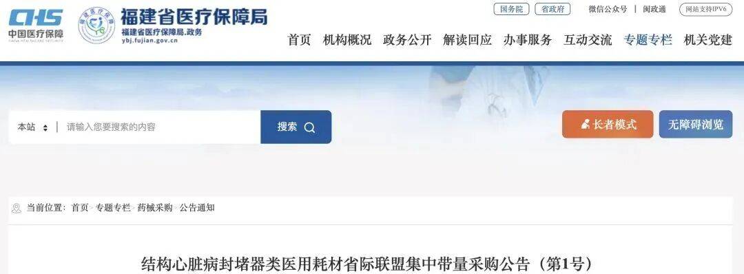 11月12日,福建医保局发布《结构心脏病封堵器类医用耗材省际联盟集中带量采购文件》。