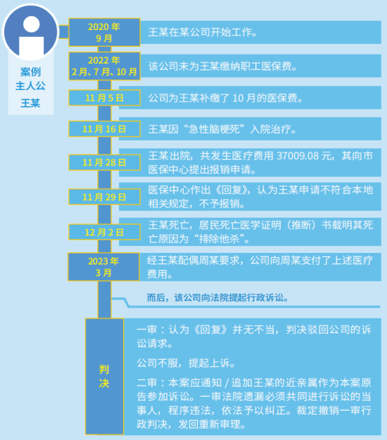 王某生前向市医保中心提出医疗费用报销申请;医保中心于2022年11月29日作出《关于参保人王某申请医疗保险待遇的回复》(以下简称《回复》),认为王某的申请不符合本地《职工医疗保险办法》的相关规定,不予报销。原因如下:(1)王某及其公司未按时缴纳2022年10月的职工医保费,故王某在2022年11月不能享受职工医保待遇;(2)王某及其公司均未按时缴纳2022年2月和7月的职工医保费,故2022年10月再次中断缴费的情况不符合职工医保的补缴及待遇规定;(3)医保中心无法判断王某断缴职工医保费期间与公司是否存在劳动关系,如存在劳动关系,建议王某向公司主张相关权利。