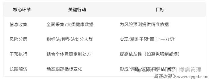 以个人健康信息收集为基础,通过风险预测划分人群(一般个体/高危个体/患者),制定个体化干预计划,并通过随访评估持续优化管理流程(闭环循环)。