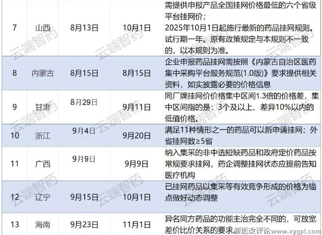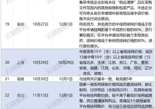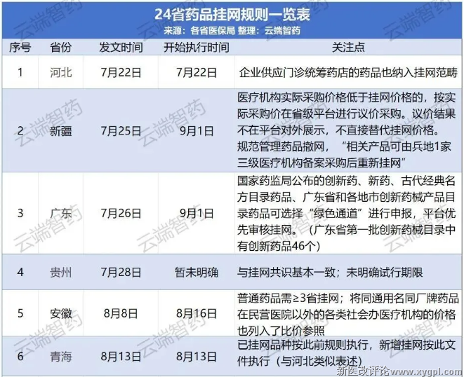 目前,全有已有24省发布正式药品挂网规则文件,包括:河北、新疆、广东、贵州、安徽、青海、山西、内蒙古、甘肃、浙江、广西、辽宁、海南、宁夏、江西、陕西、河南、山东、重庆、上海、福建、湖北、云南、吉林挂网规则已经成文。其余各省均发出征求意见稿并完成了意见征稿。