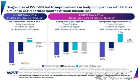 更值得关注的是,WVE公布了其靶向INHBE的GalNAc-siRNA在研药物WVE-007的I期(INLIGHT试验)积极数据。结果显示,该药物在减少内脏脂肪方面效果显著,尤为关键的是,其在减脂的同时并未造成明显的肌肉流失。这一“高质量减重”的潜力,被市场解读为可能克服现有疗法的核心瓶颈,WVE股价随之暴涨近150%。