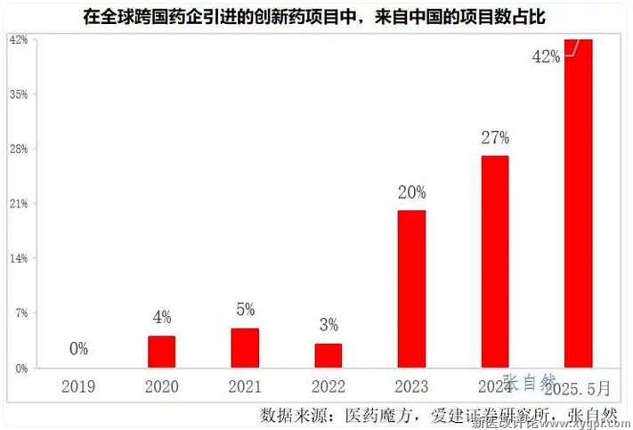 如下图所示,2025年1~5月,在全球大型跨国药企(MNC)引进的首付款超5000万美元的创新药项目中,有42%来自中国,2024年这一比例仅为27%。