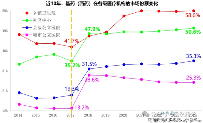 在乡镇卫生院、县级公立医院、城市社区卫生服务中心,2024年的基药市场份额较扩容前2017年的分别增长了16.9%、15.4%和16%,均高于同期城市公立医院12.1%的增幅。