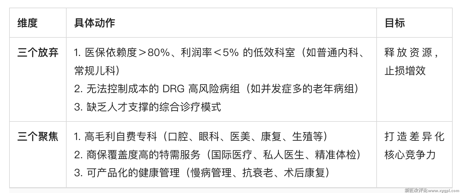 民营医院去医保化经营,核心是从 "医保依赖" 转向 "医保托底、自费与商保盈利" 的多元收入结构,关键在于战略聚焦、业务产品化、支付渠道拓展与运营效率提升,而非简单放弃医保资质。以下是系统的落地路径与实操要点。