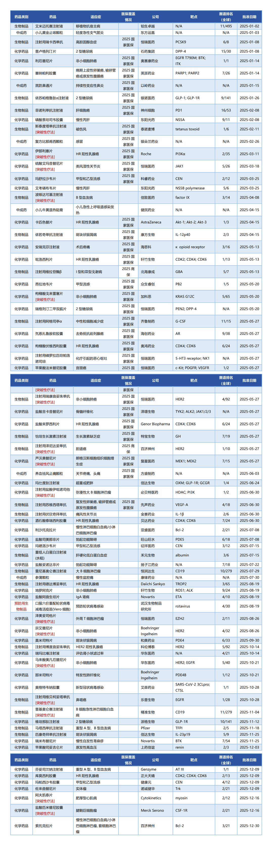 国家医保弥补保障空白的努力,不仅体现在对于上述“缺药少药”的罕见疾病的覆盖上,即便是对于一些已经有相对较多治疗药物的乳腺癌、肺癌等大病种,当有革新性或者首创新的治疗手段问世后,也能及时纳入保障范围,为患者提供实惠。比如针对HR阳性乳腺癌的小分子PI3Kα抑制剂伊那利塞片(突破性疗法,全球赛道排名2/35)、针对HER2突变非小细胞肺癌的HER2单抗药物注射用瑞康曲妥珠单抗(突破性疗法,全球赛道排名4/92)、针对KRAS突变非小细胞肺癌的枸橼酸戈来雷塞片(突破性疗法,全球赛道排名5/65),这些2025年获批的创新药都是同靶点和适应症首次出现在国家医保目录之中。当然,对于基本医疗保障已经充分的领域,部分1类新药同样难以进入医保目录,也体现了国家医保局对差异化创新的态度。