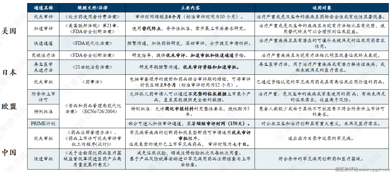 中美欧日罕见病药物加速审评通道、规则文件、主要内容及适用条件
