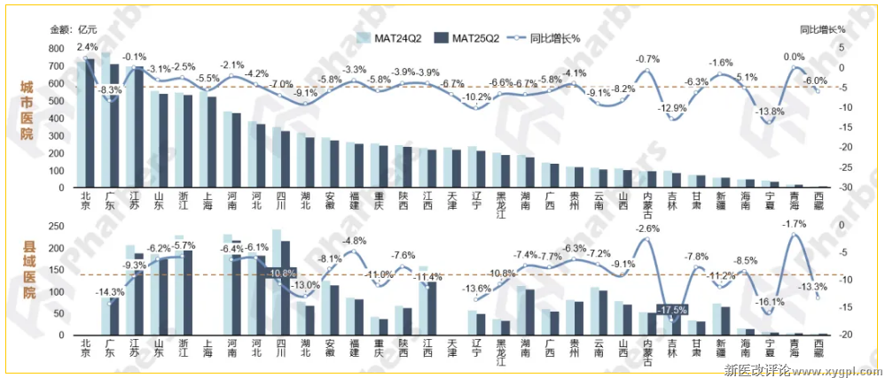 图3-MAT25Q2医院渠道市场省份表现(城市医院 vs 县域医院)