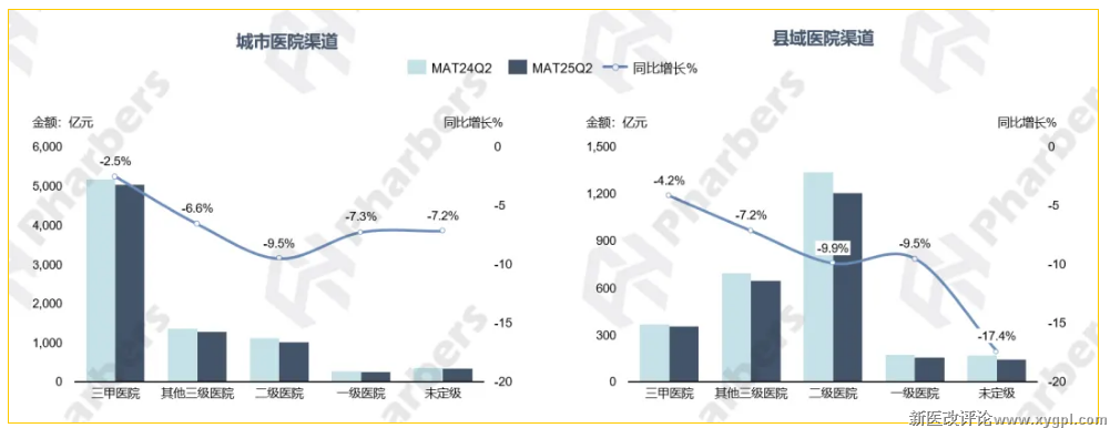 根据法伯全渠道数据显示,我国县域医院渠道MAT25Q2药品市场规模增速低于城市医院渠道(-8.6% vs -4.4%)(图1)。与城市医院渠道相比,县域医院渠道药品平均价格降幅较大,药品销售数量增速则相对较高。