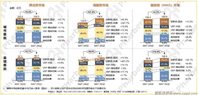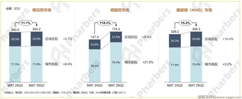 根据法伯院内渠道数据显示,虽然我国医院渠道MAT25Q2药品市场整体呈负增长,但是三个慢病市场规模均同比正增长,尤其是降压药和糖尿病市场,在县域医院渠道的规模增速高于城市医院(图1)。