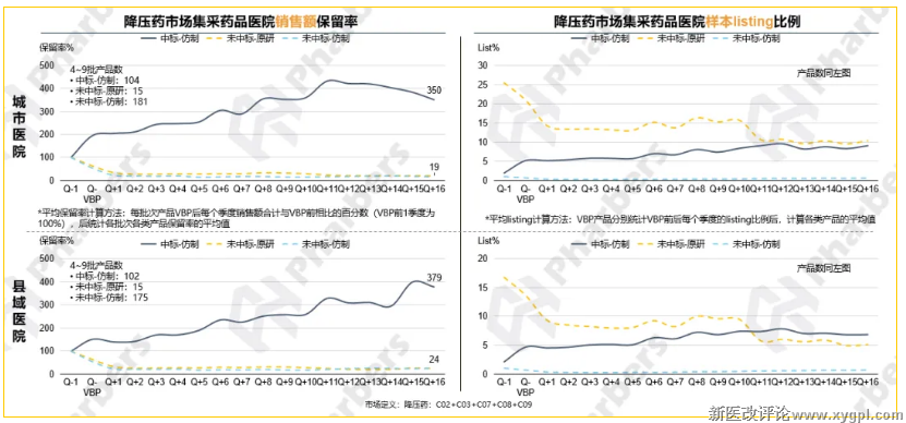 转而聚焦VBP市场,可以从集采药品医院销售额保留率和医院样本listing比例两方面,对各类慢病用药市场进行分析。