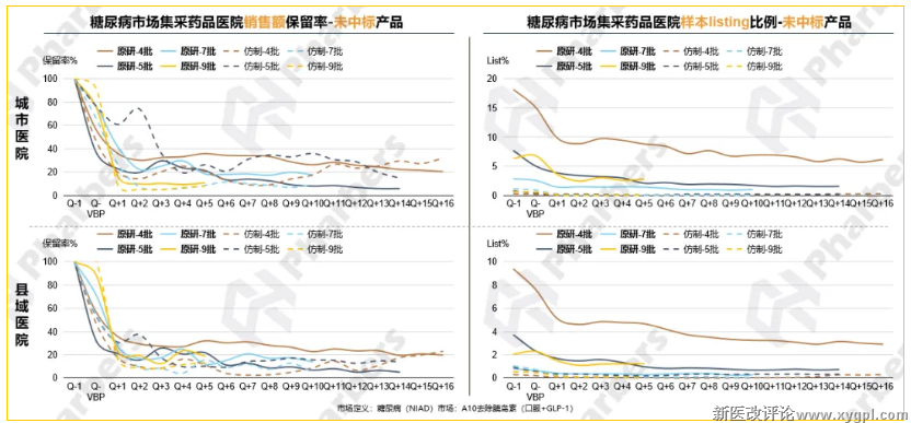 最后关注糖尿病VBP市场,法伯数据显示,中标仿制产品listing比例在城市和县域医院均高于未中标原研;但从保留率角度分析,与其他慢病市场相比,中标仿制产品并未出现明显(3倍)的高增长(图8)。