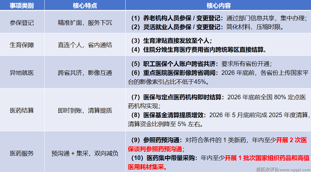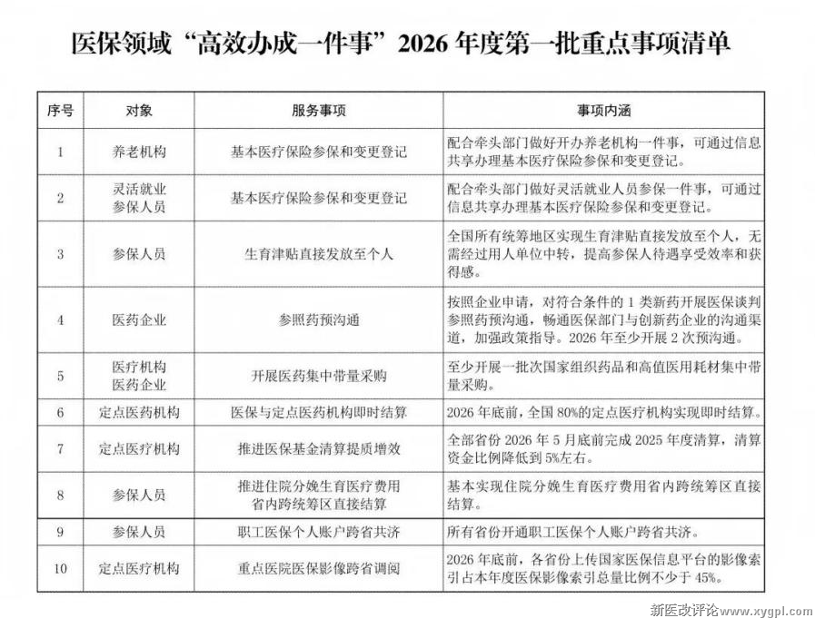 2026年2月10日,国家医保局发布《医保领域“高效办成一件事”2026年度第一批重点事项清单》,共10项重点任务,覆盖 参保登记、生育保障、异地就医、医药结算、基金管理、集采服务 等全链条。