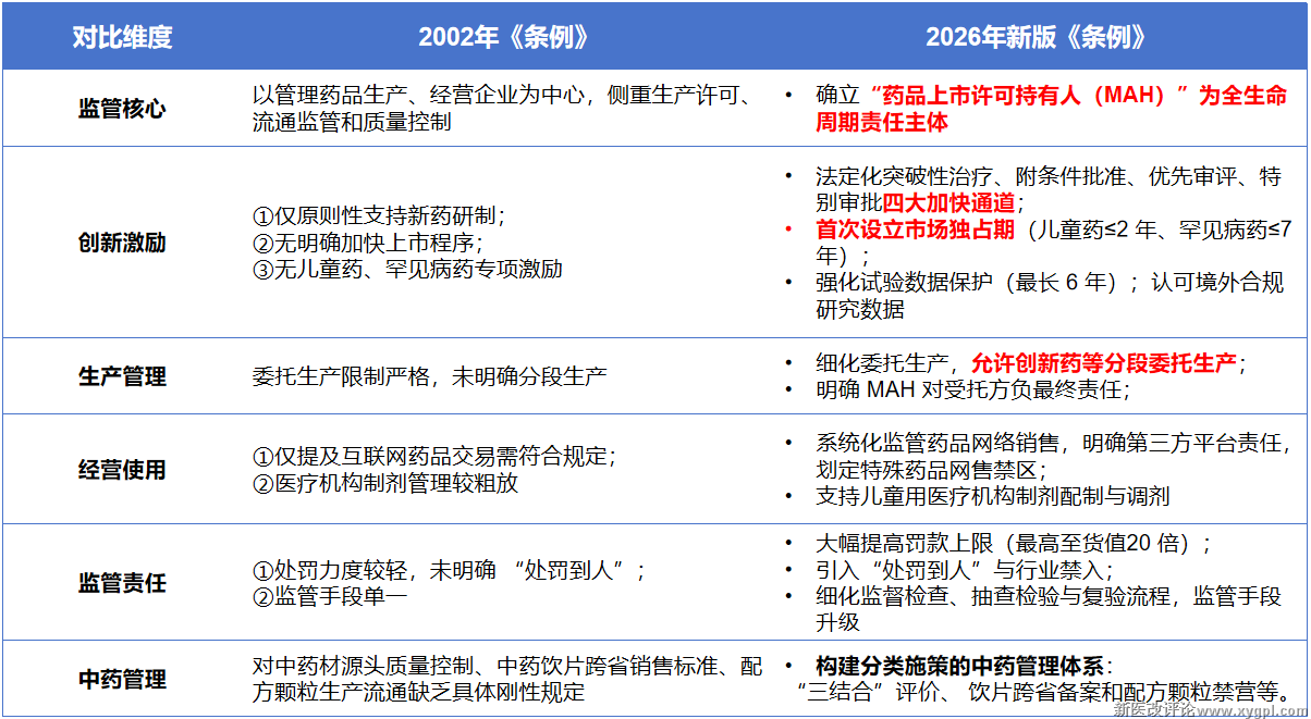 2002 年版《条例》以仿制药管理为基础,重点围绕生产许可与流通环节实施管理;2026 年新版《条例》则完成了从“行政许可体系”到“法定权利体系”的根本性转型: