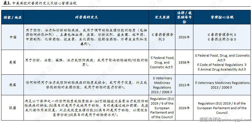 各国对于兽药的定义基本一致,皆会强调其使用对象为动物,且主要作用是用于预防、治疗、诊断动物疾病或有目的地调节动物生理机能。