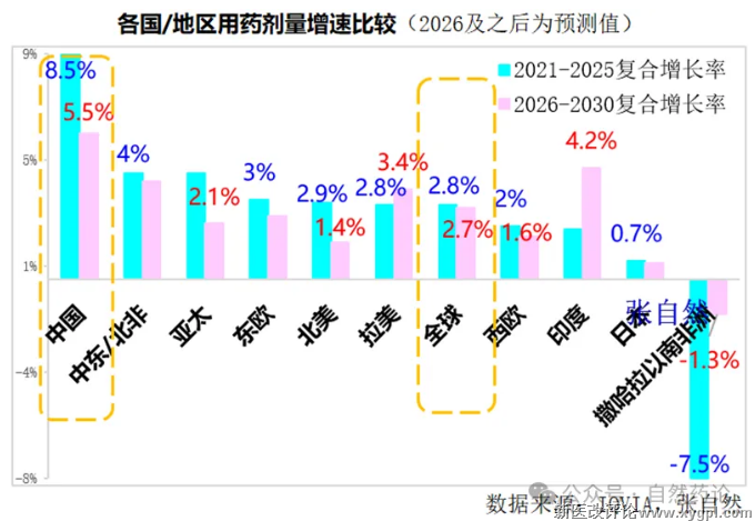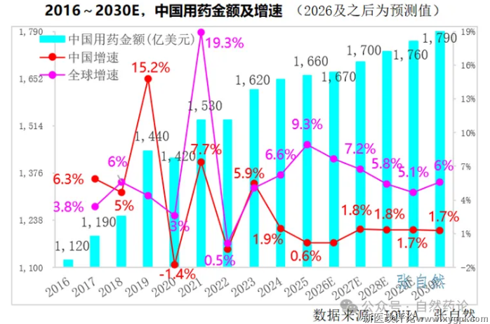 据IQVIA预测,“十五五”(2026-2030)期间,我国用药金额复合年均增长率将进一步下降至1.5%,全球的约为5-8%(取中位数6.5%),我国增速不足全球增速的1/4。
