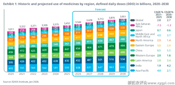 到2030年,亚太地区与中国合计贡献全球用药量增长的一半以上,中国用药量增速预计将低于前五年水平。