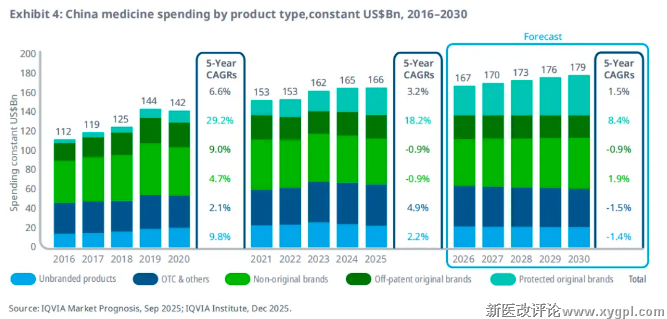 过去五年间,中国药品支出增长主要由受专利保护的原研品牌药驱动,这些药品多来自跨国公司,年均增长率达18.2%,占总支出的比例从2016年的3.6%攀升至2025年的16.9%。