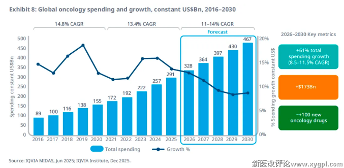 过去五年肿瘤药物支出增长88%,2025年达到2910亿美元。