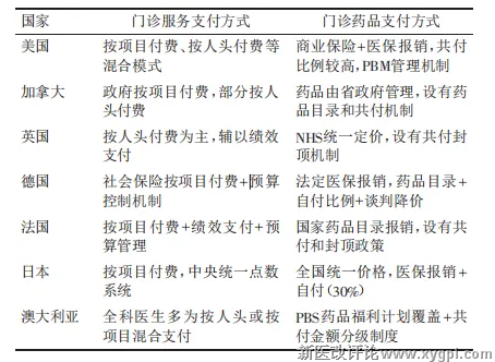 表1 各国门诊服务支付方式和门诊药品支付方式